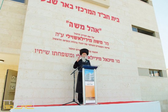 בטקס מכובד ובהשתתפות רבנים אישי ציבור בני המשפחה וידידים מהארץ ומחו"ל, התקיים טקס הסרת הלוט מעל בניין בית חבד המרכזי בבאר שבע ● השלמת הבניין נעשתה בזכות תרומתו של מר מיכאל מירילאשוילי לעילוי נשמת אביו . באירוע נשאו דברים: חכם משה מיכלאשוילי - הרב הראשי ליהודי גרוזיה, הרב יצחק דוד גרוסמן - רבה של מגדל העמק והרב יעקב גגולשוילי - רב קהילה באשדוד
