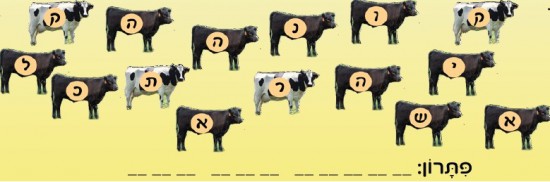 בְּפָרָשָׁתֵנוּ מְדֻבָּר עַל מִצְוַת פָּרָה אֲדֻמָּה. אִסְפוּ אֶת הָאוֹתִיּוֹת רַק מִן הַפָּרוֹת בַּצֶּבַע הַמַּתְאִים וְגַלּוּ מִשְׁפָּט שֶׁמּוֹפִיעַ גַּם הוּא, בְּפֵרוּשׁ רַשִּׁ"י לְפָרָשַׁת חֻקַּת. בְּהַצְלָחָה!