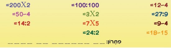 הַחֹפֶשׁ הַגָּדוֹל בְּעִצּוּמוֹ. הָבָה נְרַעְנֵן קְצָת אֶת הַמֹּחַ עִם תַּרְגִּילֵי חֶשְׁבּוֹן. פִּתְרוּ אֶת הַתַּרְגִּילִים. הִפְכוּ כָּל תּוֹצָאָה לְגִימַטְרִיָּה וְכָךְ תְּגַלּוּ בִּטּוּי הַקָּשׁוּר לְשָׁבוּעַ זֶה.