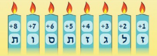 בְּחַג הַחֲנֻכָּה אָנוּ מוֹסִיפִים בְּכָל יוֹם נֵר אֶחָד. הוֹסִיפוּ לְכָל אַחַת מֵהָאוֹתִיּוֹת שֶׁלִּפְנֵיכֶם אֶת הַמִּסְפָּר הָרָשׁוּם מֵעָלֶיהָ וְגַלּוּ בִּטּוּי הַקָּשׁוּר לַתְּקוּפָה.