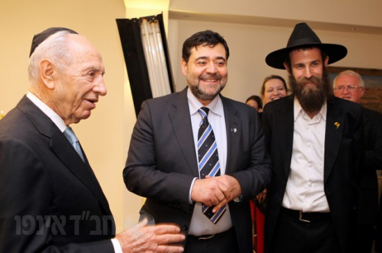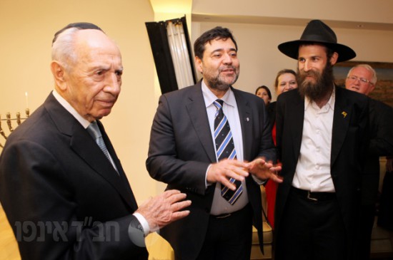 משלחת אגודת חסידי חב"ד באה"ק הדליקה נר שלישי של חנוכה במשכן של הפרזידנט מר שמעון פרס בירושלים, בהשתתפות כל צוות לשכתו ועובדי המשכן.