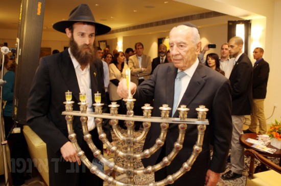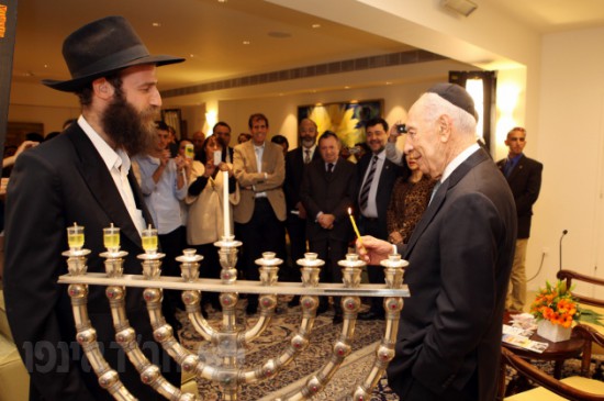 משלחת אגודת חסידי חב"ד באה"ק הדליקה נר שלישי של חנוכה במשכן של הפרזידנט מר שמעון פרס בירושלים, בהשתתפות כל צוות לשכתו ועובדי המשכן