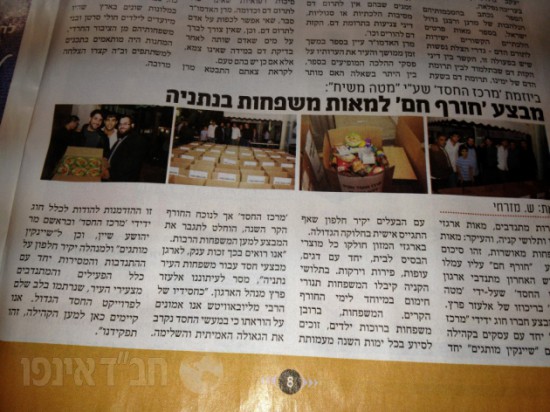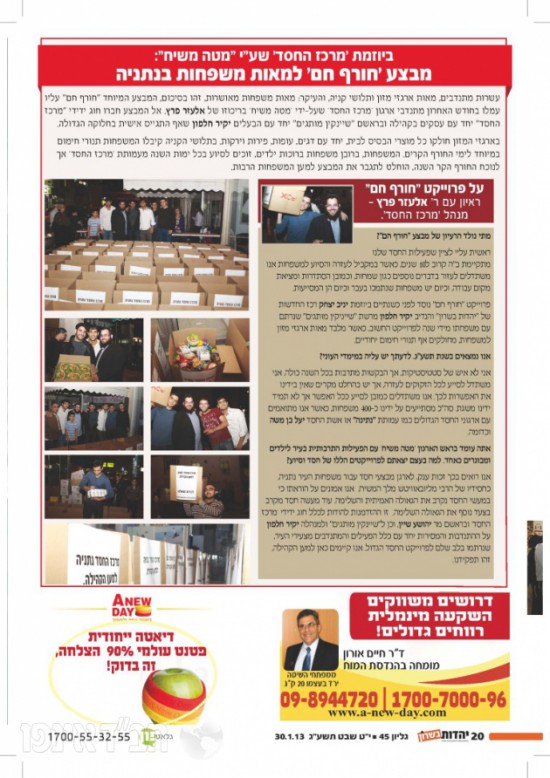 עמותת 'מרכז החסד' שעל-ידי 'מטה משיח' נתניה, ערכה גם השנה את מבצע "חורף חם" למאות משפחות מצוקה מהעיר נתניה. ארגזי מזון, תלושי קניה ותנורי חימום חולקו למאות משפחות בעיר.