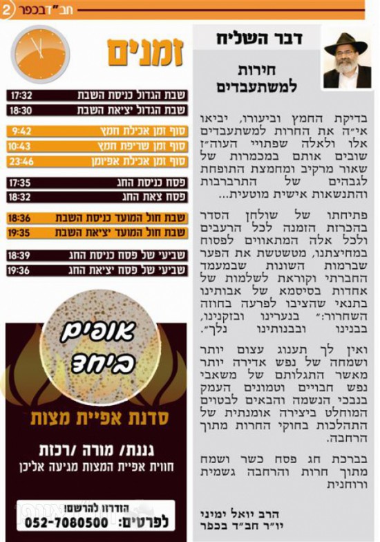 בתי חב"ד בעיר בראשות שליח הרבי הרב יואל ימיני הגבירו את פעילותם במהלך החודש שהחל בחלוקת מצה שמורה למאות מתושבי העיר חברי מועצת העיר, מחלקות העירייה, ואנשי עסקים, ממשיך בפעילות חסרת תקדים בסדנת אפיית מצות בהשתתפות למעלה מ- 1500 ילדים