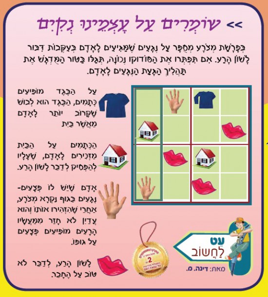 בְּפָרָשַׁת מְצֹרָע מְסֻפָּר עַל נְגָעִים שֶׁמַּגִּיעִים לָאָדָם בְּעִקְּבוֹת דִּבּוּר לָשׁוֹן הָרַע. אִם תִּפְתְּרוּ אֶת הַסּוֹדוּקוּ נְכוֹנָה, תְּגַלּוּ בַּטּוּר הַמֻּדְגָּשׁ אֶת תַּהֲלִיךְ הַגָּעַת הַנְּגָעִים לָאָדָם.