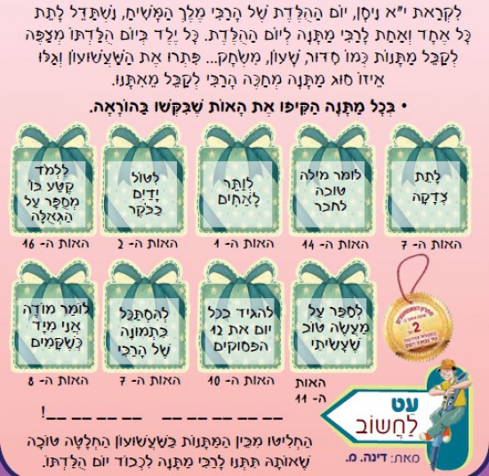 לִקְרַאת י"א נִיסָן, יוֹם הַהֻלֶּדֶת שֶׁל הָרַבִּי מֶלֶךְ הַמָּשִׁיחַ, נִשְׁתַּדֵּל לָתֵת כָּל אֶחָד וְאַחַת לָרַבִּי מַתָּנָה לְיוֹם הַהֻלֶּדֶת. כָּל יֶלֶד בְּיוֹם הֻלַּדְתּוֹ מְצַפֶּה לְקַבֵּל מַתָּנוֹת כְּמוֹ סִדּוּר, שָׁעוֹן, מִשְׂחָק... פִּתְרוּ אֶת הַשַּׁעֲשׁוּעוֹן וְגַלּוּ אֵיזוֹ סוּג מַתָּנָה מְחַכֶּה הָרַבִּי לְקַבֵּל מֵאִתָּנוּ. בְּכָל מַתָּנָה הַקִּיפוּ אֶת הָאוֹת שֶׁבִּקְּשׁוּ בַּהוֹרָאָה.