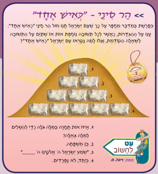 בְּפָרָשַׁת בַּמִּדְבָּר מְסֻפָּר עַל כָּךְ שֶׁעַם יִשְׂרָאֵל חָנוּ מוּל הַר סִינַי "כְּאִישׁ אֶחָד". עֲנוּ עַל הַהַגְדָּרוֹת, כַּאֲשֶׁר לְכָל תְּשׁוּבָה נוֹסֶפֶת אוֹת אוֹ שְׁתַּיִם עַל הַתְּשׁוּבָה לַשְּׁאֵלָה הַקּוֹדֶמֶת, וְגַלּוּ לָמָּה נִקְרְאוּ עַם יִשְׂרָאֵל "כְּאִישׁ אֶחָד"?