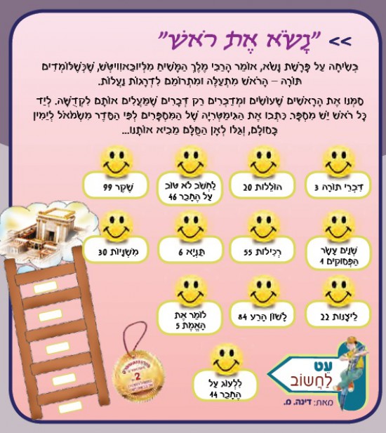 בְּשִׂיחָה עַל פָּרָשַׁת נָשֹׂא, אוֹמֵר הָרַבִּי מֶלֶךְ הַמָּשִׁיחַ מִלְּיוּבַּאוִויטְשׁ, שֶׁכְּשֶׁלּוֹמְדִים תּוֹרָה – תהָרֹאשׁ מִתְעַלֶּה וּמִתְרוֹמֵם לִדְרָגוֹת נַעֲלוֹת. סַמְּנוּ אֶת הָרָאשִׁים שֶׁעוֹשִׂים וּמְדַבְּרִים רַק דְּבָרִים שֶׁמַּעֲלִים אוֹתָם לִקְדֻשָּׁה, וְהַכְנִיסוּ אוֹתָם לַסֻּלָּם. לְיַד כָּל רֹאשׁ יֵשׁ מִסְפָּר. אִם מִיַּנְתֶּם נָכוֹן, כִּתְבוּ אֶת הַגִּימַטְרִיָּה שֶׁל הַמִּסְפָּרִים לְפִי הַסֵּדֶר , וְגַלּוּ לְאָן הַסֻּלָּם מֵבִיא אוֹתָנוּ...