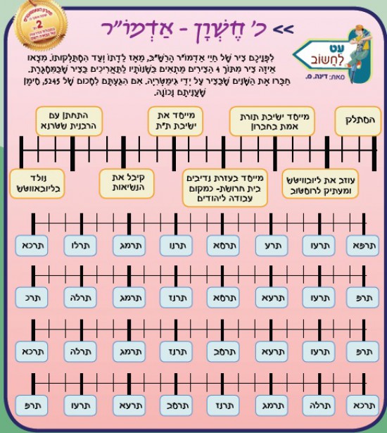 לִפְנֵיכֶם צִיר שֶׁל חַיֵּי אַדְמוֹ"ר הָרַשַּׁ"בּ, מֵאָז לֵדָתוֹ וְעַד הִסְתַּלְּקוּתוֹ. מִצְאוּ אֵיזֶה צִיר מִתּוֹךְ 4 הַצִּירִים מַתְאִים בִּשְׁנוֹתָיו לַתַּאֲרִיכִים בַּצִּיר שֶׁבַּמִּסְגֶּרֶת. חַבְּרוּ אֶת הַשָּׁנִים שֶׁבַּצִּיר עַל יְדֵי גִּימַטְרִיָּה. אִם הִגַּעְתֶּם לִסְכוּם שֶׁל 5245, סִימָן שֶׁעֲנִיתֶם נְכוֹנָה.