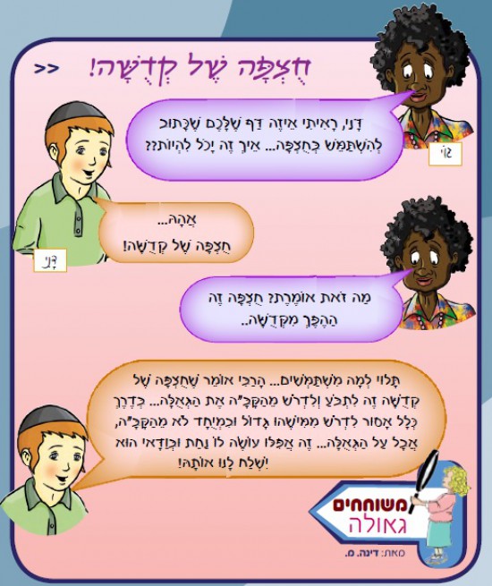 דָּנִי: תָּלוּי לְמָה מִשְׁתַּמְּשִׁים... הָרַבִּי אוֹמֵר שֶׁחֻצְפָּה שֶׁל קְדֻשָּׁה זֶה לִתְבֹּעַ וְלִדְרֹשׁ מֵהַקָּבָּ"ה אֶת הַגְּאֻלָּה... בְּדֶרֶךְ כְּלָל אָסוּר לִדְרֹשׁ מִמִּישֶׁהוּ גָּדוֹל וּבִמְיֻחָד לֹא מֵהַקָּבָּ"ה, אֲבָל עַל הַגְּאֻלָּה... זֶה אֲפִלּוּ עוֹשֶׂה לוֹ נַחַת וּבְּוַדָּאי הוּא יִשְׁלַח לָנוּ אוֹתָהּ!