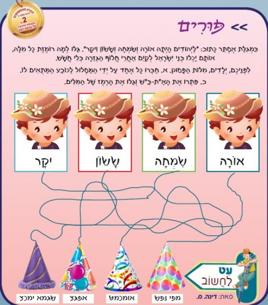 בִּמְגִלַּת אֶסְתֵּר כָּתוּב: "לַיְּהוּדִים הָיְתָה אוֹרָה וְשִׂמְחָה וְשָׂשׂוֹן וִיקָר ". גַּלּוּ לְמָה רוֹמֶזֶת כָּל מִלָּה, אוֹתָם יָכְלוּ בְּנֵי יִשְׂרָאֵל לְקַיֵּם אַחֲרֵי חֲלוֹף הַגְּזֵרָה בְּלִי חֲשָׁשׁ. לִפְנֵיכֶם, יְלָדִים, מִלּוֹת הַפָּסוּק. א. חַבְּרוּ כָּל אֶחָד עַל יְדֵי הַמַּסְלוּל לַכּוֹבַע הַמַּתְאִים לוֹ. ב. פִּתְרוּ אֶת הָאַ"ת-בַּ"שׁ וְגַלּוּ אֶת הָרֶמֶז שֶׁל הַמִּלִּים.