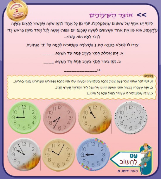 לְיוֹסִי יֵשׁ אֹסֶף שֶׁל שְׁעוֹנִים שֶׁהִתְקַלְקְלוּ. יוֹסִי כִּוֵּן כָּל אֶחָד לִזְמַן שׁוֹנֶה שֶׁקָּשׁוּר לַחַגִּים בַּשָּׁנָה (לְדֻגְמָא, הוּא כִּוֵּן אֶת אַחַד הַשְּׁעוֹנִים לַשָּׁעָה שֶׁנִּכְנָס יוֹם כִּפּוּר) וְעָשָׂה לְכָל אֶחָד סִימָן בָּרֹאשׁ כְּדֵי לִזְכֹּר לְמָה הוּא קָשׁוּר... עִזְרוּ לוֹ לִמְצֹא בַּתֵּבָה אֶת 2 הַשְּׁעוֹנִים הַקְּשׁוּרִים לְפֶסַח עַל יְדֵי הַנְּתוּנִים.