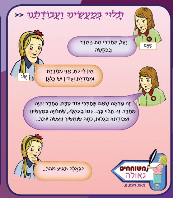 זֶה מַרְאֶה שֶׁאִם תְּסַדְּרִי עוֹד קְצָת, הַחֶדֶר יִהְיֶה מְסֻדָּר. זֶה תָּלוּי בָּךְ... כְּמוֹ בַּגְּאֻלָּה, שֶׁתְּלוּיָה בְּמַעֲשֵׂינוּ וַעֲבוֹדָתֵנוּ בַּגָּלוּת, כַּמָּה שֶׁנַּמְשִׁיךְ וְנַעֲשֶׂה יוֹתֵר...