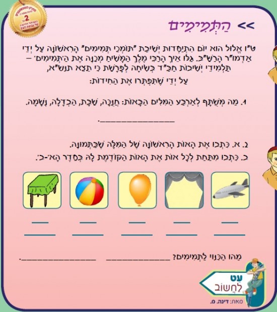 ט"ו אֱלוּל הוּא יוֹם הִתְיַסְּדוּת יְשִׁיבַת "תּוֹמְכֵי תְּמִימִים" הָרִאשׁוֹנָה עַל יְדֵי אַדְמוֹ"ר הָרַשַּׁ"בּ. גַּלּוּ אֵיךְ הָרַבִּי מֶלֶךְ הַמָּשִׁיחַ מְכַנֶּה אֶת הַ'תְּמִימִים' – תַּלְמִידֵי יְשִׁיבוֹת חַבַּ"ד בְּשִׂיחָה לְפָרָשַׁת כִּי תֵצֵא תנש"א, עַל יְדֵי שֶׁתִּפְתְּרוּ אֶת הַחִידוֹת