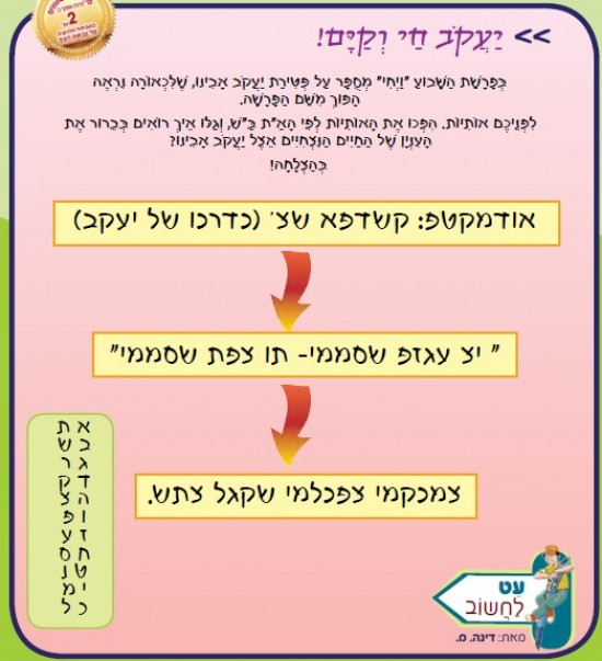 בְּפָרָשַׁת הַשָּׁבוּעַ "וַיְחִי" מְסֻפָּר עַל פְּטִירַת יַעֲקֹב אָבִינוּ, שֶׁלִּכְאוֹרָה נִרְאֶה הָפוּךְ מִשֵּׁם הַפָּרָשָׁה. לִפְנֵיכֶם אוֹתִיּוֹת. הִפְכוּ אֶת הָאוֹתִיּוֹת לְפִי הָאַ"ת בַּ"שׁ, וְגַלּוּ אֵיךְ רוֹאִים בְּבֵרוּר אֶת הָעִנְיָן שֶׁל הַחַיִּים הַנִּצְחִיִּים אֵצֶל יַעֲקֹב אָבִינוּ?