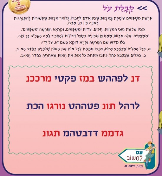 פָּרָשַׁת מִשְׁפָּטִים עוֹסֶקֶת בְּמִצְווֹת שֶׁבֵּין אָדָם לַחֲבֵרוֹ, כְּלוֹמַר מִצְווֹת שֶׁקְּשׁוּרוֹת לְהִתְנַהֲגוּת רְאוּיָה בֵּין בְּנֵי אָדָם. מִבֵּין שְׁלֹשֶׁת סוּגֵי הַמִּצְווֹת: חֻקִּים, עֵדוֹת וּמִשְׁפָּטִים, נִקְרְאָה הַפָּרָשָׁה 'מִשְׁפָּטִים'.