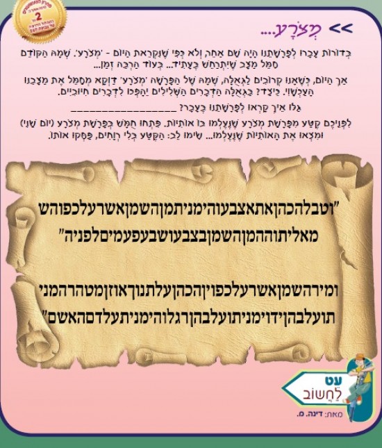 בְּדוֹרוֹת עָבָרוּ לְפָרָשָׁתֵנוּ הָיָה שֵׁם אַחֵר, וְלֹא כְּפִי שֶׁנִּקְרֵאת הַיּוֹם - 'מְצֹרָע'. שְׁמָהּ הַקּוֹדֵם סִמֵּל מַצָּב שֶׁיִּתְרַחֵשׁ בֶּעָתִיד... בְּעוֹד הַרְבֵּה זְמַן...