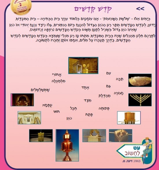 לִפְנֵיכֶם חֵלֶק מֵהַכֵּלִים שֶׁהָיוּ בְּבֵית הַמִּקְדָּשׁ. מִתְחוּ קַו רַק מִכְּלִי שֶׁנִּמְצָא בְּקֹדֶשׁ הַקָּדָשִׁים לְקֹדֶשׁ הַקָּדָשִׁים. בַּדֶּרֶךְ תַּעַבְרוּ עַל מִלִּים, אִסְפוּ אוֹתָן וְחַבְּרוּ לִתְשׁוּבָה.