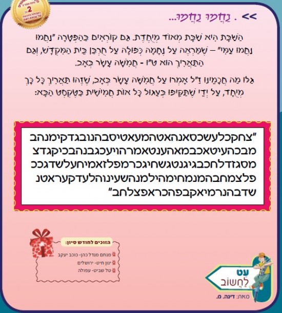 הַשַּׁבָּת הִיא שַׁבָּת מְאוֹד מְיֻחֶדֶת. גַּם קוֹרְאִים בַּהַפְטָרָה "נַחֲמוּ נַחֲמוּ עַמִּי" – שֶׁמַּרְאֶה עַל נֶחָמָה כְּפוּלָה עַל חֻרְבַּן בֵּית הַמִּקְדָּשׁ, וְגַם הַתַּאֲרִיךְ הוּא ט"ו - חֲמִשָּׁה עָשָׂר בְּאָב. גַּלּוּ מַה חֲכָמֵינוּ זַ"ל אָמְרוּ עַל חֲמִשָּׁה עָשָׂר בְּאָב, שֶׁזֶּהוּ תַּאֲרִיךְ כָּל כָּךְ מְיֻחָד, עַל יְדֵי שֶׁתַּקִּיפוּ בְּעִגּוּל כָּל אוֹת חֲמִישִׁית בַּטֶּקְסְט הַבָּא: