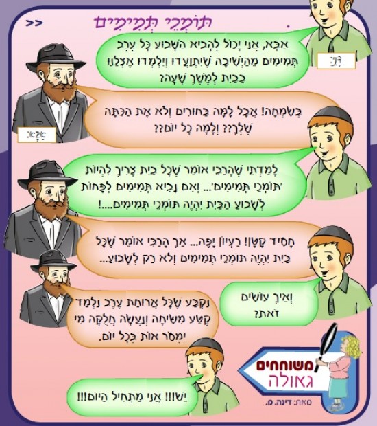 לָמַדְתִּי שֶׁהָרַבִּי אוֹמֵר שֶׁכָּל בַּיִת צָרִיךְ לִהְיוֹת 'תּוֹמְכֵי תְּמִימִים'... וְאִם נָבִיא תְּמִימִים לְפָחוֹת לְשָׁבוּעַ הַבַּיִת יִהְיֶה תּוֹמְכֵי תְּמִימִים....!