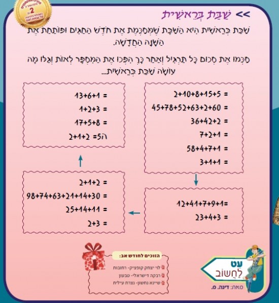 שַׁבַּת בְּרֵאשִׁית הִיא הַשַּׁבָּת שֶׁמְּסַכֶּמֶת אֶת חֹדֶשׁ הַחַגִּים וּפוֹתַחַת אֶת הַשָּׁנָה הַחֲדָשָׁה. סַכְּמוּ אֶת סְכוּם כָּל תַּרְגִּיל וְאַחַר כָּךְ הִפְכוּ אֶת הַמִּסְפָּר לְאוֹת וְגַלּוּ מָה עוֹשָׂה שַׁבַּת בְּרֵאשִׁית...