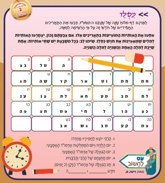 אִסְפוּ אֶת הָאוֹתִיּוֹת הַמּוֹפִיעוֹת בְּתַאֲרִיכִים אֵלּוּ. אִם צְבַעְתֶּם נָכוֹן, יִצְטָרְפוּ הָאוֹתִיּוֹת לְמִלִּים שֶׁמְּאַפְיְנוֹת אֶת חֹדֶשׁ כִּסְלֵו. שִׂימוּ לֵב: בְּכָל מִשְׁבֶּצֶת יֵשׁ שְׁתֵּי אוֹתִיּוֹת: אַחַת שַׁיֶּכֶת לַמִּלָּה הָאַחַת וְהַשְּׁנִיָּה לַמִּלָּה הַשְּׁנִיָּה.