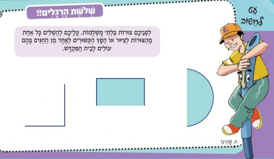 לִפְנֵיכֶם צוּרוֹת בִּלְתִּי מֻשְׁלָמוֹת. עֲלֵיכֶם לְהַשְׁלִים כָּל אַחַת מֵהַצּוּרוֹת לְצִיּוּר אוֹ חֵפֶץ הַקְּשׁוּרִים לְאֶחָד מִן הַחַגִּים בָּהֶם עוֹלִים לְבֵית הַמִּקְדָּשׁ.