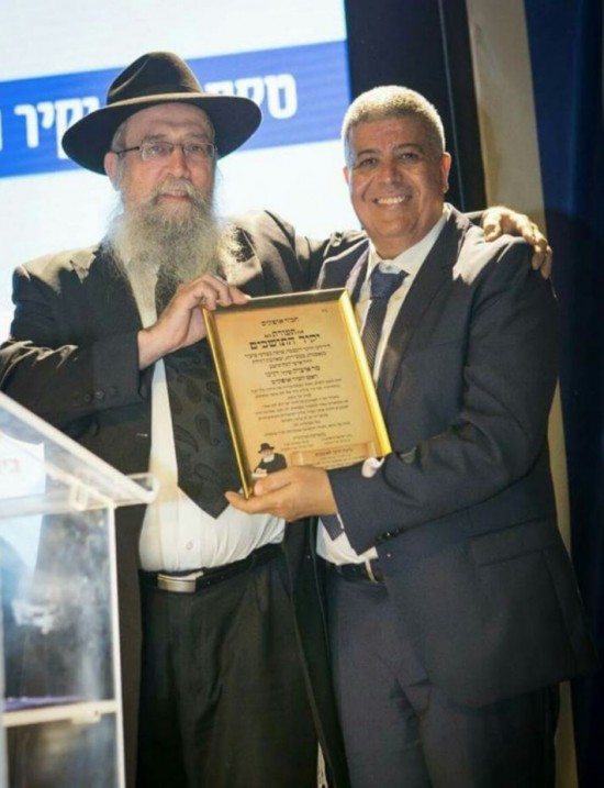 ראש העיר עלה לבמה לקבל את התעודה ולא הסתיר את התרגשותו מהרעיון אותו יזם הרב הרשקוביץ בחשאי עם עוזר ראש העיר.