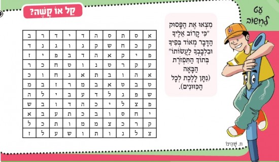 מִצְאוּ אֶת הַפָּסוּק "כִּי קָרוֹב אֵלֶיךָ הַדָּבָר מְאוֹד בְּפִיךָ וּבִלְבָבְךָ לַעֲשׂוֹתוֹ" בְּתוֹךְ הַתִּפְזֹרֶת הַבָּאָה (נִתָּן לָלֶכֶת לְכָל הַכִּוּוּנִים).