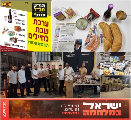 מנסיון צרכי החיילים בעבר, בימים אלו מכינים במרכז האריזה של ניידות חב"ד – 50,000 ערכות שבת לחיילים בשטחי כינוס ובאזורים ללא תנאים • הערכות כוללות: נרות שבת, יין וגביע לקידוש + נוסח הקידוש, חלה, טונה ומתבלים, עוגה אישית, נר ובשמים להבדלה